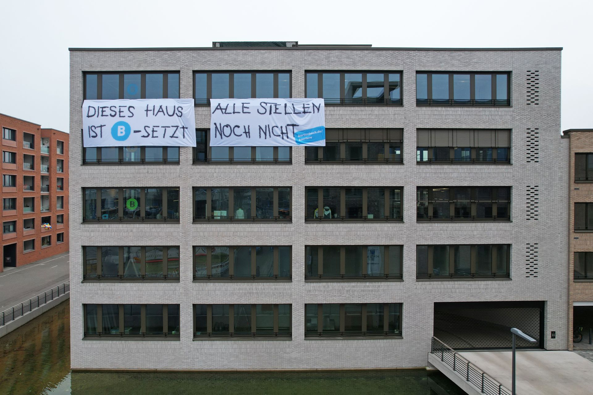 Einige Teilnehmende am morgendlichen Berufsverkehr auf der Rheinallee kamen heute an der Ampel in Höhe Kaiser-Karl-Ring kurz ins Stocken. Im Mainzer Zollhafen hingen nämlich plötzlich handbesprühte Stoffbahnen, wie man sie aus der Hausbesetzerszene der 70er- und 80er-Jahre kennt, an der Fassade eines Bürogebäudes am Kaufmannshof 1. Hier residiert seit Januar 2023 die Mainzer Kommunikations- und Werbemittel-Agentur Bartenbach. Bei den Plakaten handelt es sich daher auch nicht um politische Botschaften von Hausbesetzer*innen, sondern um einen aufmerksamkeitsstarken Appell an junge Mainzer Nachbar*innen und Jobsuchende aus der gesamten Rhein-Main-Region, sich zu bewerben: „Dieses Haus ist B-setzt. Alle Stellen noch nicht.“