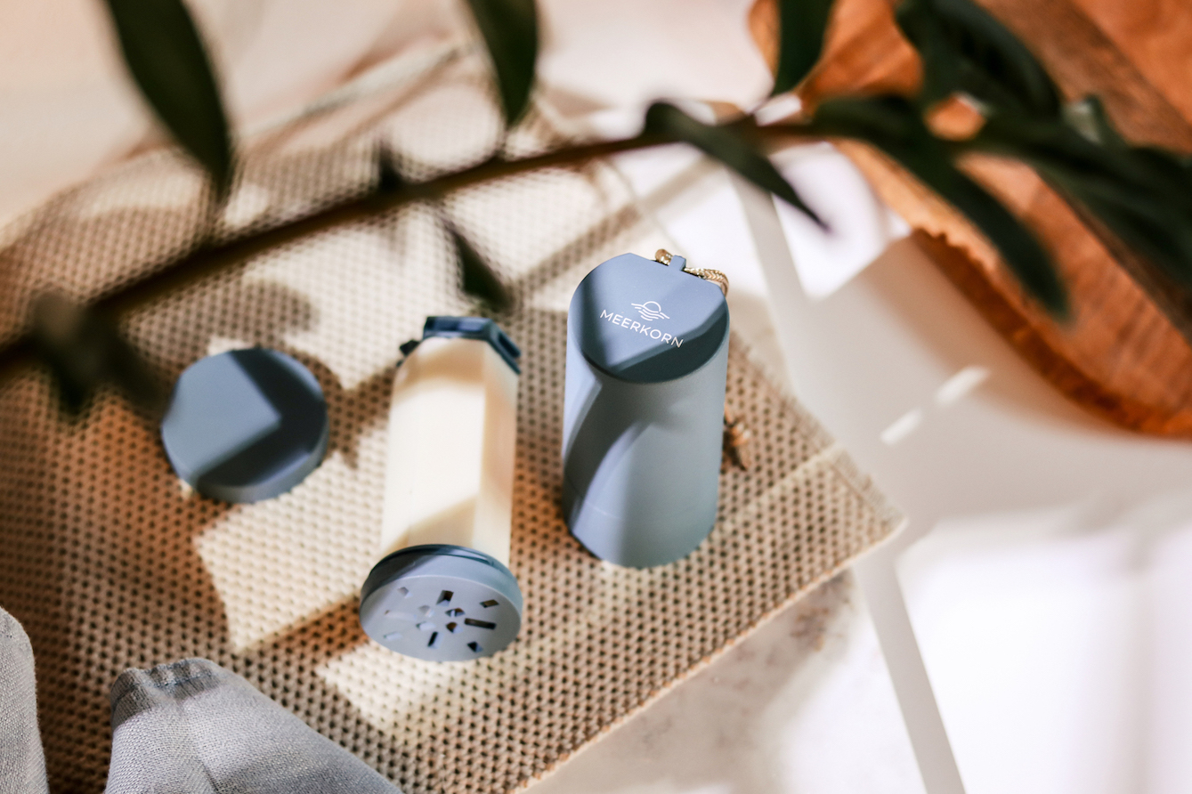 Die Seifenmühle von Meerkorn (https://meerkorn.de) wird zu 100 % aus recycelten Fischernetzen hergestellt. Das Gründungspaar Jennifer Wolf und André Postler hat es geschafft, dem eigentlichem Müll in den Meeren einen Wert zu geben. Die Verwendung von Fischernetzen und -Seilen zur Produktion von nachhaltigen Produkten ist ein Beitrag für sauberere Meere – und gleichzeitig ein finanzieller Anreiz, die Netze dort erst gar nicht landen zu lassen. Ein extrem relevanter Ansatz, wenn man bedenkt, dass Fischernetze für ca. 60 % der Meeres-Verschmutzung verantwortlich sind.