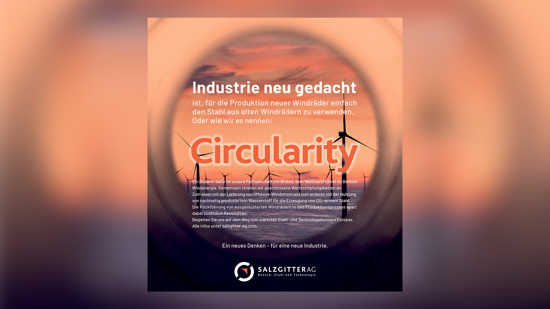 Kernbegriff der neuen Strategie sowie der Kampagne, die sich an Meinungsführer aus Wirtschaft und Politik richtet, ist der Begriff „Circularity“. Er steht immer im Zentrum der kreisförmig angelegten Bildwelten. Eingeleitet werden die Motive jeweils mit dem Definitionssatz „Industrie neu gedacht ist,…“.