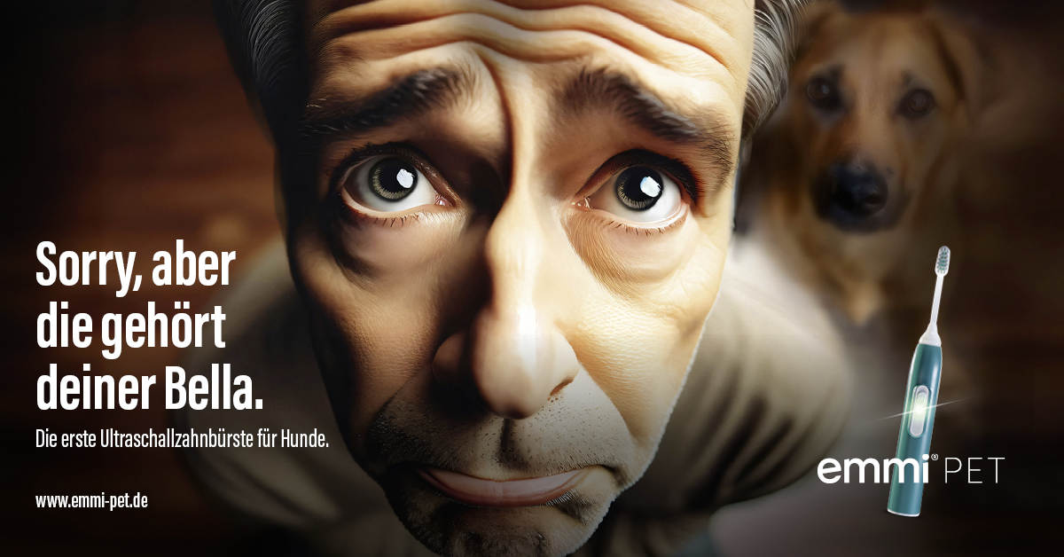 Den Kern der Kampagne bilden Motive, die Frauchen:Herrchen zeigen, wie sie mit einem herzerweichenden Hundeblick sich eine emmi® PET-Zahnbürste erbetteln wollen. Das Besondere an diesen Motiven: sie wurden mit Hilfe von KI entwickelt!