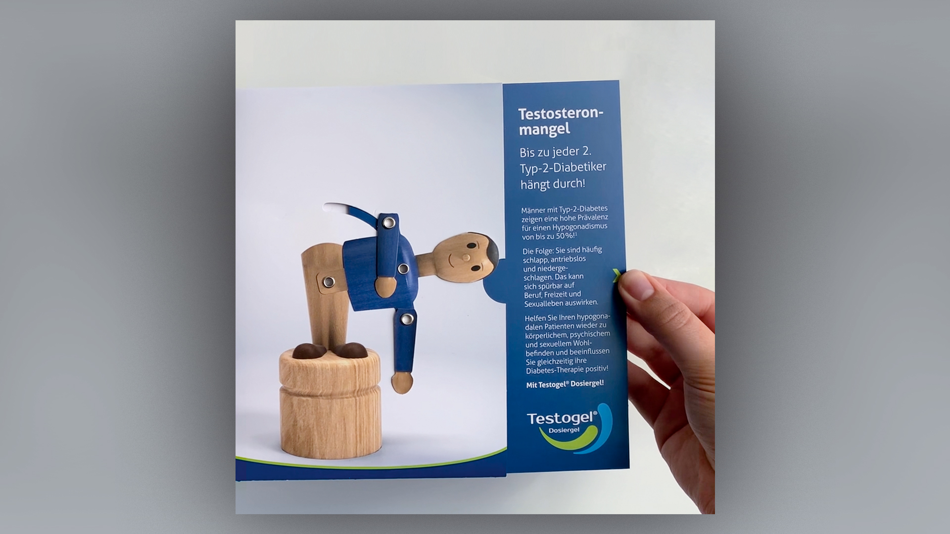Um Testosteronmangel als ernstzunehmendes Problem unter Medizinern*innen anzusiedeln, erfand Schmittgall HEALTH für Testogel® von DR. KADE / BESINS das erste Pop-Down Mailing der Welt. Das Anschreiben zeigt anhand eines bereits als Key Visual etablierten Stehaufmännchens aus Holz, wie Patienten mit Testosteronmangel vor den Herausforderungen ihres Lebens einknicken.
