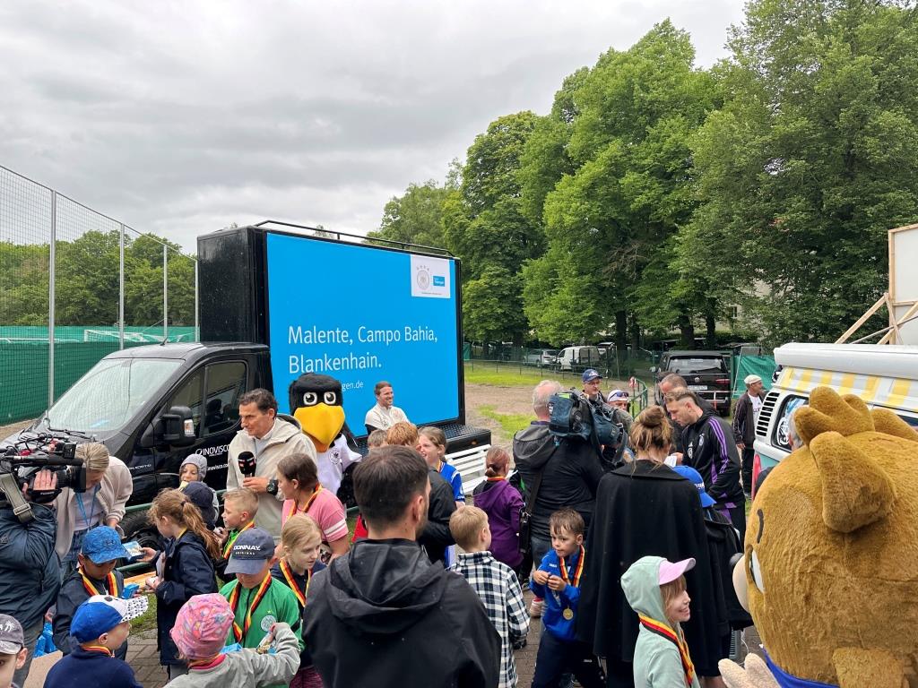 Unter dem Motto „Den Feinschliff holt sich das DFB-Team in Thüringen“ setzte die Begleitkampagne das Potenzial des Freistaats als modernes und vielseitiges Bundesland in Szene – und umfasste dabei eine Vielzahl von Maßnahmen: Dazu gehörte die contentreiche Ausgestaltung des Medienzentrums im Schloss Blankenhain ebenso wie der Einsatz mobiler Großflächen an gut frequentierten Orten – darunter das öffentliche Training der National-Elf in Jena vor 15.000 Fans. Im digitalen Raum erzielte die Kampagne ebenfalls reichweitenstarke Ergebnisse. Der Kampagnen-Trailer wurde über 107.000-mal auf YouTube aufgerufen und erhielt zusätzliche Reichweite durch Platzierungen in DFB-Livestreams (ca. 230.000 Views). Auf Facebook und Instagram erreichte der Film rund sechs Mio. Ad Views. Die Presse veröffentlichte rund 12.000 Berichte über das Trainingscamp und generierte bundesweite Aufmerksamkeit für das Gastgeber-Bundesland. Erfolgreich platzierte Online-Banner und Mobile Ads sorgten für eine starke Sichtbarkeit und hohen Traffic auf der Website „Das ist Thüringen“.