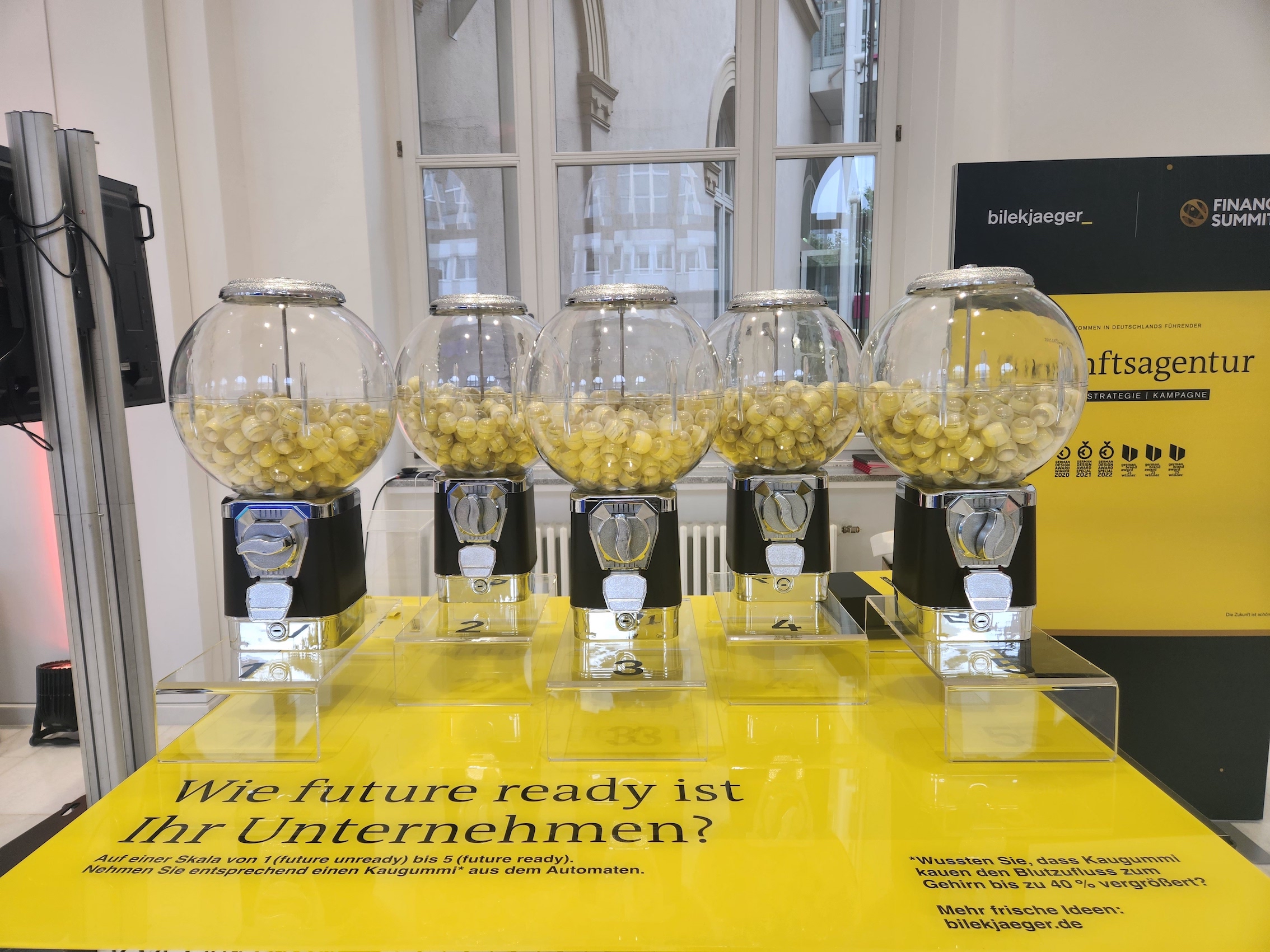 Überraschend. Inspirierend. Anders. So präsentierte sich die Stuttgarter Zukunftsagentur bilekjaeger bei der Finance Summit 2023, einer der größten Finance Messen Deutschlands organisiert von der Börse Stuttgart Group. Am leuchtend-gelben bilekjaeger Messestand konnten die führenden VertreterInnen der Finanzbranche an einem Experiment teilnehmen und selbst über Ihre Zukunftsfähigkeit abstimmen. Dabei dienten fünf Kaugummi-Automaten mit der Frage „Wie future-ready ist Ihr Unternehmen? (Skala 1-5)“ als Wahlurnen. Ein Eye-Catcher, der für viel Aufsehen sorgte, zu anregenden Gesprächen über Zukunftstrends einlud und wertvolle Leads generierte.